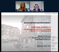 Heute fand im Rahmen unserer Master-Veranstaltung "Nachhaltiges Management" ein virtueller Praxisvortrag der Sustain Consult GmbH statt, in dem CEO Ralf Löckener und Junior Consultant Cornelia Willers über ihre Arbeit in einer Beratungsgesellschaft für nachhaltige Wirtschaftsentwicklung referiert haben. Der Vortrag war mit knapp 100 Teilnehmenden sehr gut besucht, interessant und aufschlussreich. Herzlichen Dank an die beiden Referenten!