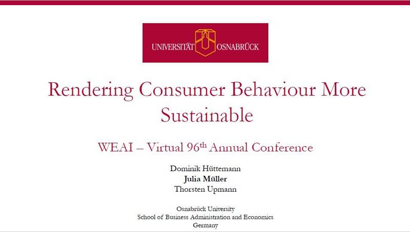 Julia Müller präsentierte heute ihr Forschungsprojekt "Rendering Consumer Behaviour More Sustainable", gemeinsam mit Dominik Hüttemann und Thorsten Upmann, in der Session AERE - [076] HUMAN PREFERENCES AND THE ENVIRONMENT der WEAI Konferenz. Eine interessante Session und gute Diskussionen.